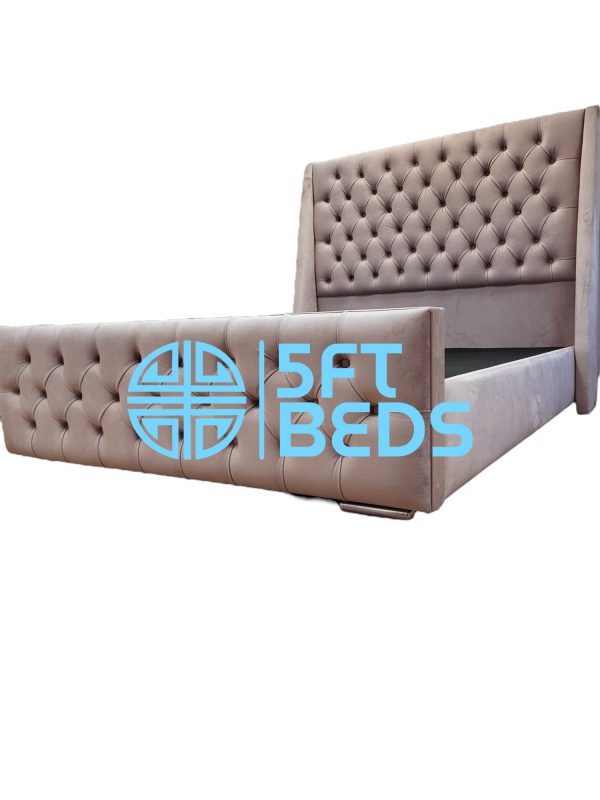 The original Hilton Wingback bed. This beautifully handcrafted deep buttoned tall 54″ headboard and foot board with a modern wing back feature on the headboard. Supplied with framed boards for extra strength rather than individual slats.